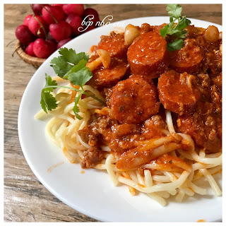 Phi thơm tỏi, cho hành Tây cắt hạt lựu vào xào thơm,cho thịt bò xay vào xào,cho xúch xích cắt lát